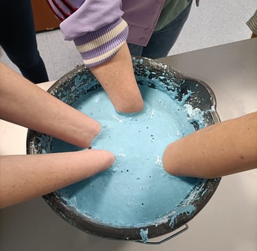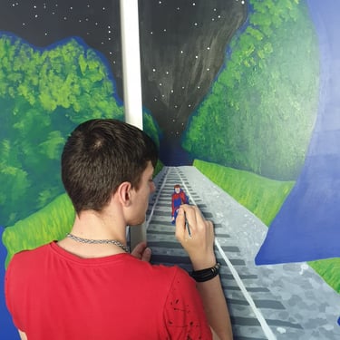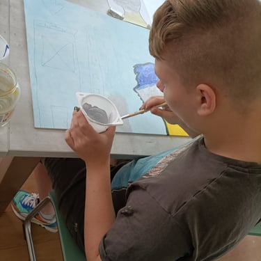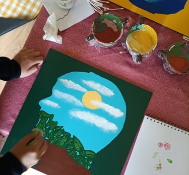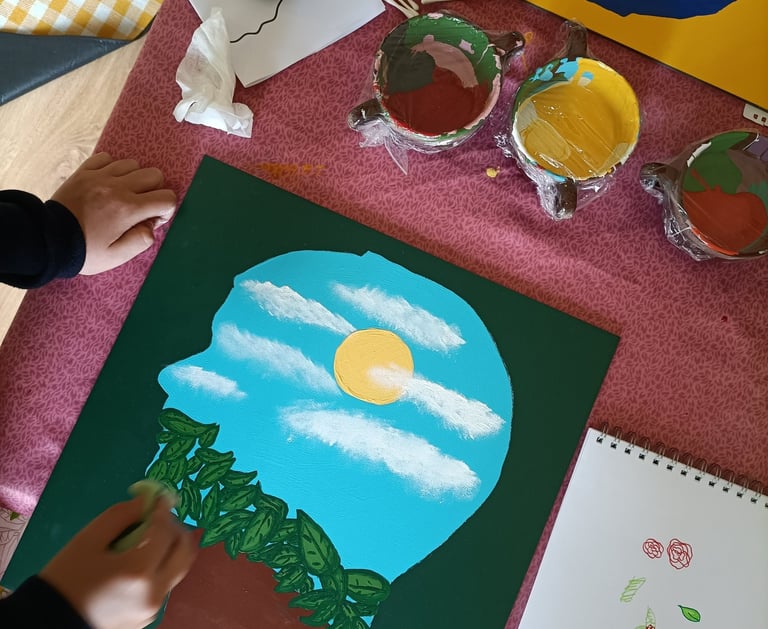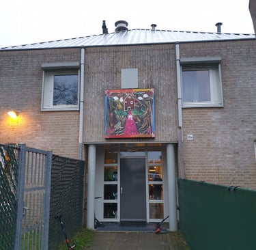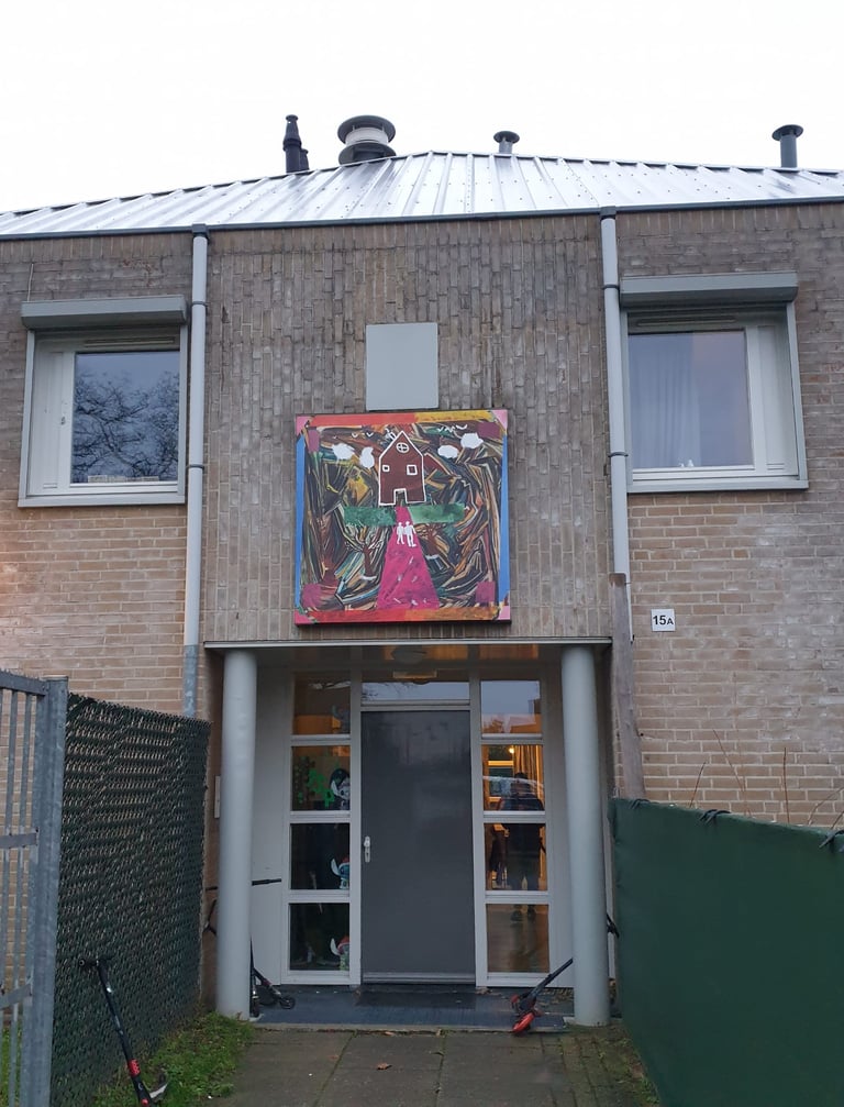 Aan het einde van 2024 was ik regelmatig in Zuid-Limburg te vinden. In de omgeving van Sittard was ik deel van een samenwerking tussen het Laagland en Koraal. Koraal is een organisatie voor jeugdhulp. Op de locatie nabij Sittard bieden zij woonruimte en onderwijs aan jongeren. Vijf weken lang kwamen leerlingen van Koraal op onze atelierzolder. Sarai Erkens en ik boden verschillende lessen aan, waar de leerlingen konden experimenteren met materiaal en technieken. Daarna gingen we met hen de diepte in, aan de hand van de vraag; 'Wat betekent thuis in je hoofd voor jou?' Er zijn verschillende mooie kunstwerken uit voortgekomen, waarvan hieronder een deel te bekijken is. Enkele van deze kunstwerken werden geprint op grote stickervellen en geplaatst boven de ingangen van de woongroepen. Zo oefenden de leerlingen blijvend invloed uit op hun eigen ruimte. Tijdens een feestelijke bijeenkomst werden deze werken onthuld.