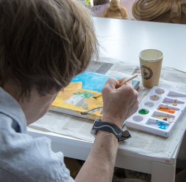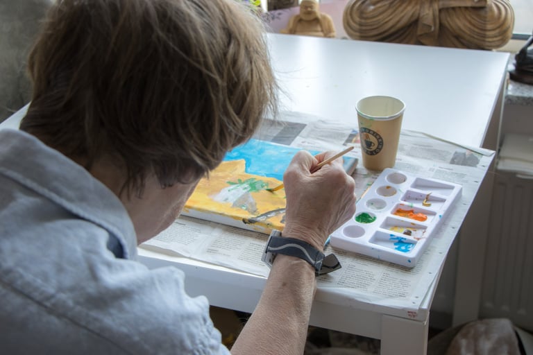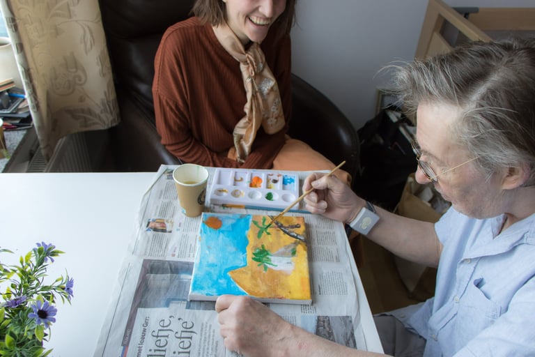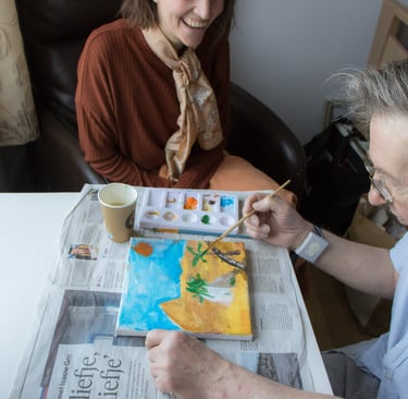 Als creatief therapeut werkte ik met bewoners die lijden aan dementie. In het verzogingstehuis Roomburgh te Leiden heb ik beeldende therapie opgezet. Ik werkte in individuele en groepstherapie aan schilderingen en andere creatieve activiteiten. Bewoners zijn heel blij met de aandacht en om te ervaren dat ze iets moois kunnen maken. Van de therapie maakte ik altijd een gezellig momentje, waar gelukkig ook veel te lachen valt. Deze momenten zijn een lichtpuntje voor veel cliënten.