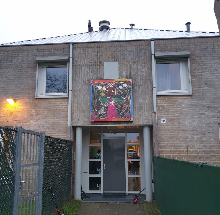 Aan het einde van 2024 was ik regelmatig in Zuid-Limburg te vinden. In de omgeving van Sittard was ik deel van een samenwerking tussen het Laagland en Koraal. Koraal is een organisatie voor jeugdhulp. Op de locatie nabij Sittard bieden zij woonruimte en onderwijs aan jongeren. Vijf weken lang kwamen leerlingen van Koraal op onze atelierzolder. Sarai Erkens en ik boden verschillende lessen aan, waar de leerlingen konden experimenteren met materiaal en technieken. Daarna gingen we met hen de diepte in, aan de hand van de vraag; 'Wat betekent thuis in je hoofd voor jou?' Er zijn verschillende mooie kunstwerken uit voortgekomen, waarvan hieronder een deel te bekijken is. Enkele van deze kunstwerken werden geprint op grote stickervellen en geplaatst boven de ingangen van de woongroepen. Zo oefenden de leerlingen blijvend invloed uit op hun eigen ruimte. Tijdens een feestelijke bijeenkomst werden deze werken onthuld.
